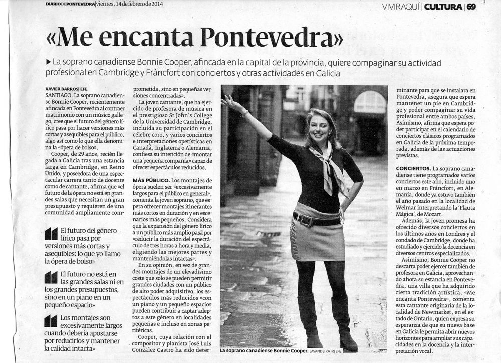 La soprano canadiense Bonnie Cooper, recientemente afincada en Pontevedra al contraer matrimonio con un músico gallego, cree que el futuro del género lírico pasa por hacer versiones más cortas y asequibles para el público, algo así como lo que ella denomina la "ópera de bolso".
