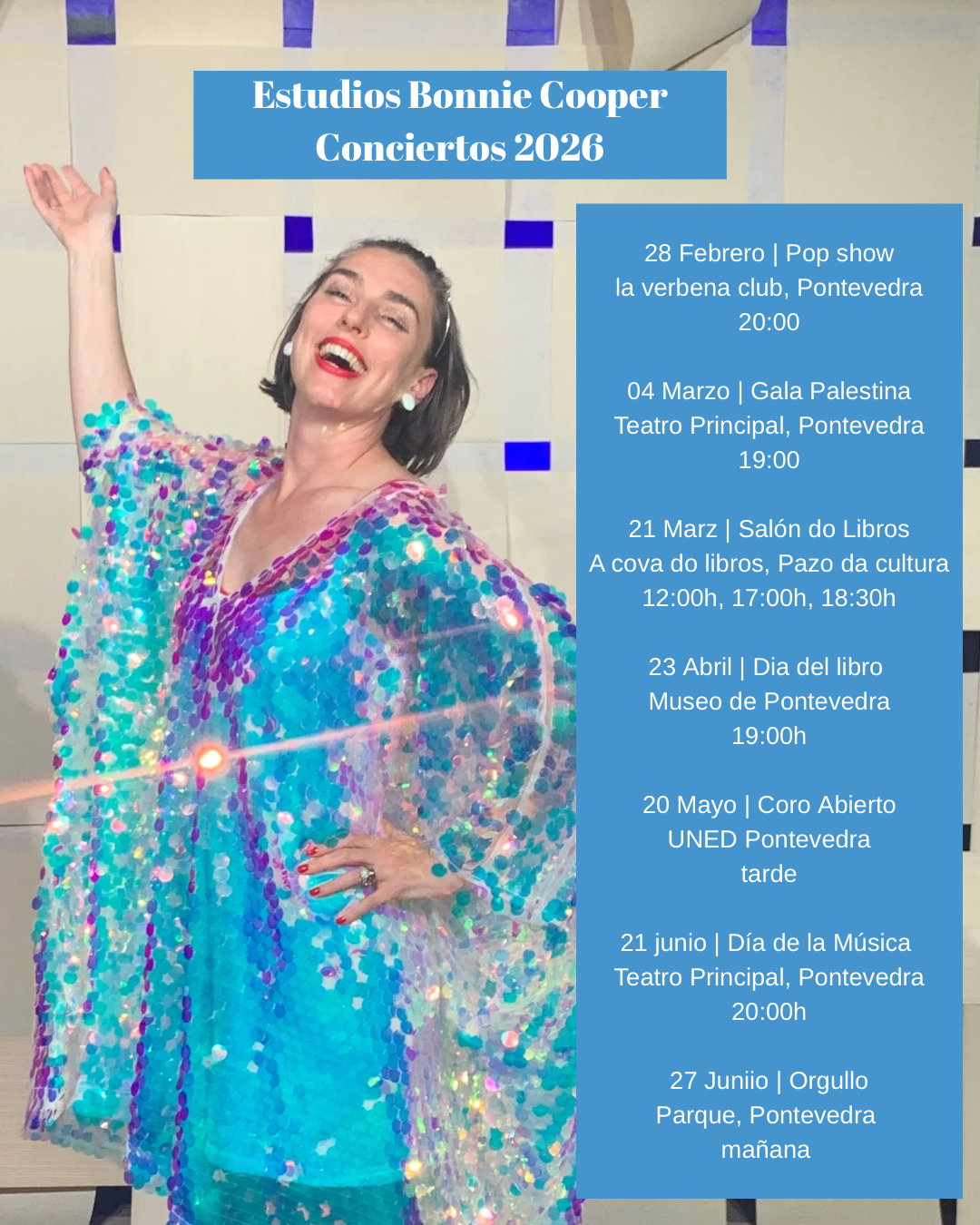 Soy Bonnie Cooper, soprano Canadiense y profesora de canto. Vivo y enseño en Pontevedra, Galicia. Canto en coros de Galicia y también soy solista para grupos musicales en Galicia e Inglaterra.